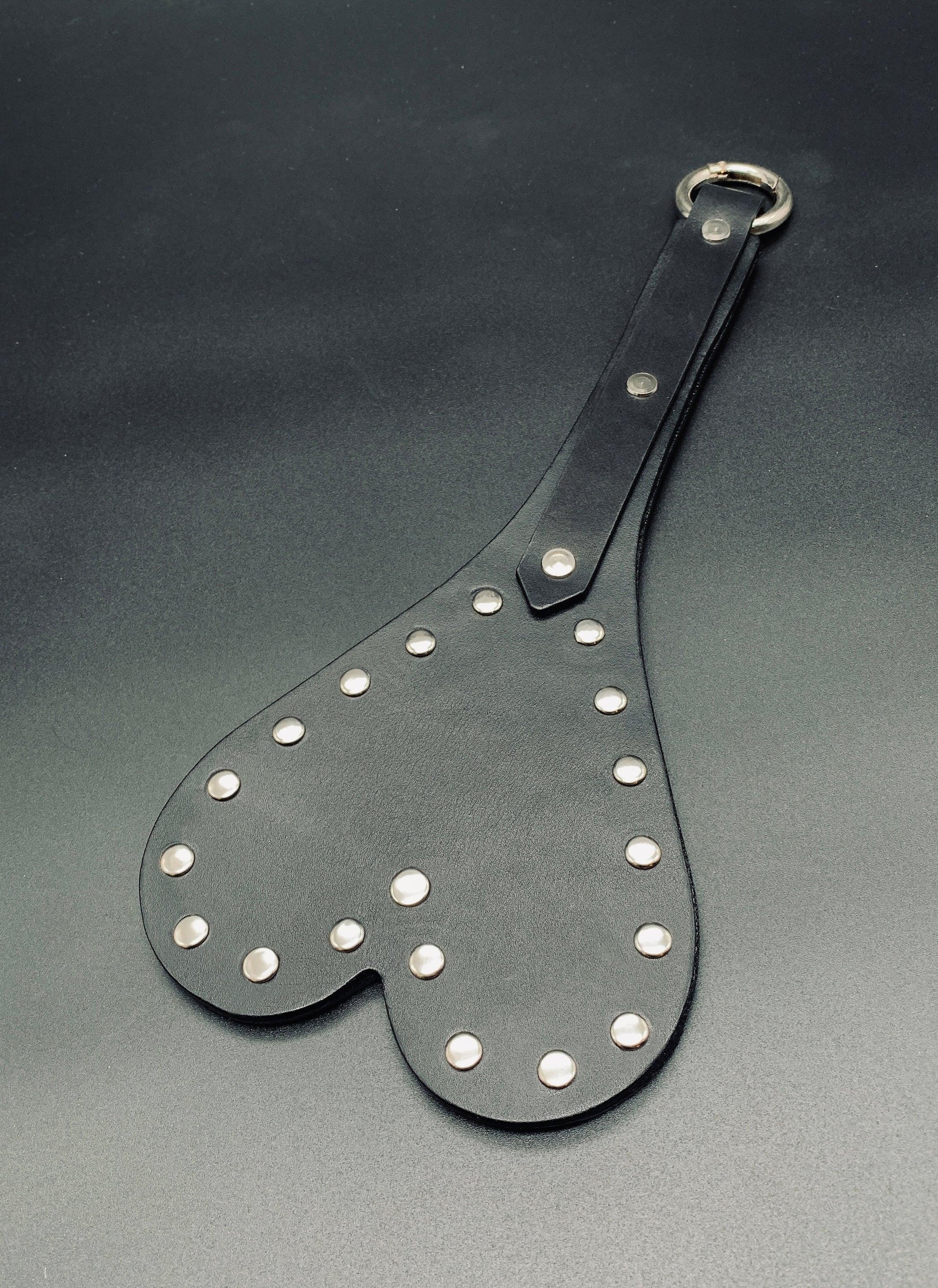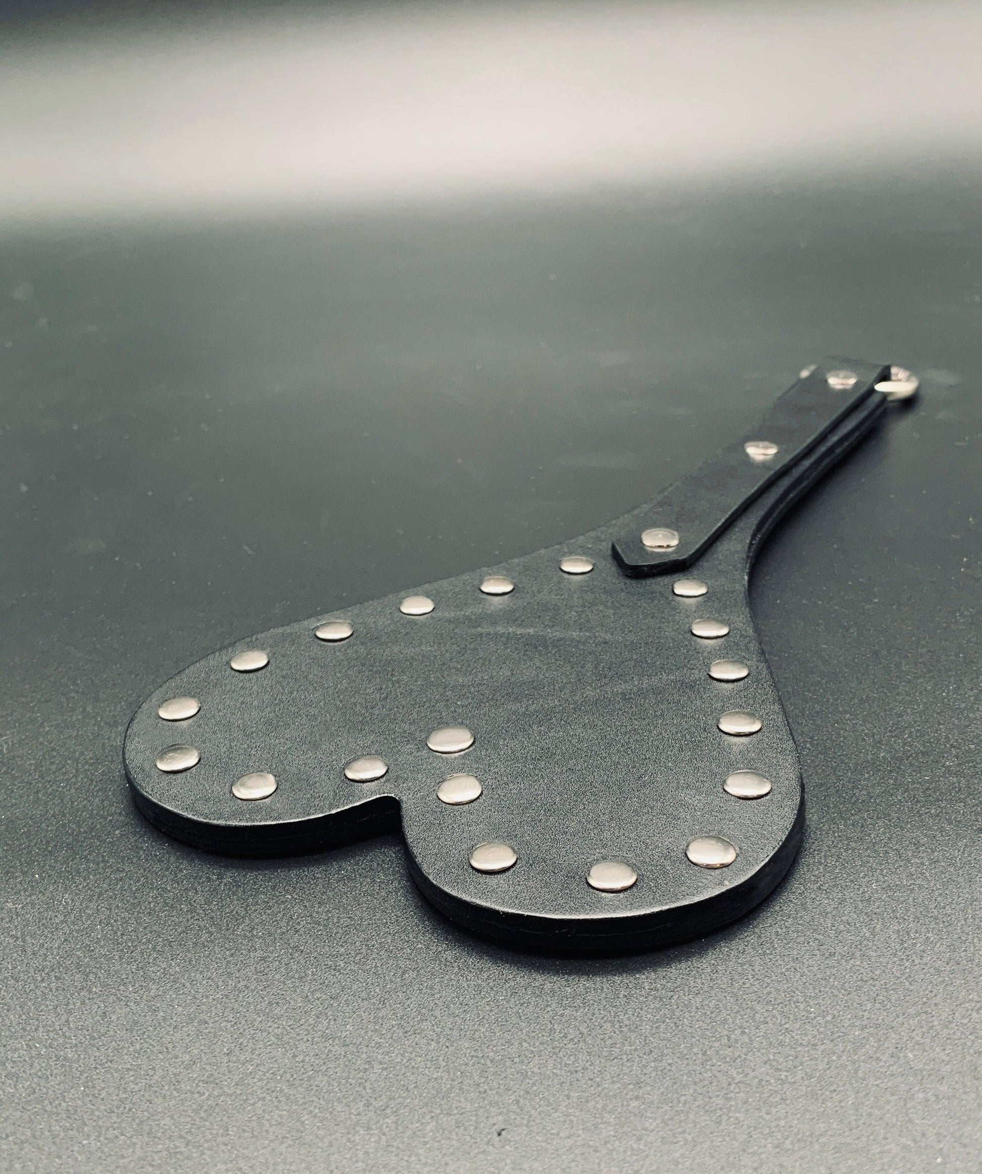 Druuna studded heart shape paddle is a play tool, hand made from a double layer tick full grain leather. This Metatron's piece features a robust handle with carabiner for a comfortable hold. This adorable heart shape paddle design is suitable for light to experienced levels of play, from beginner to veterans. So cute, yet so powerful.