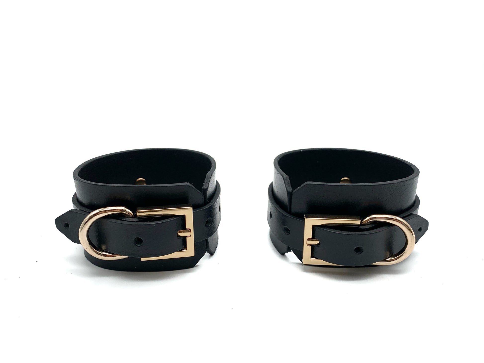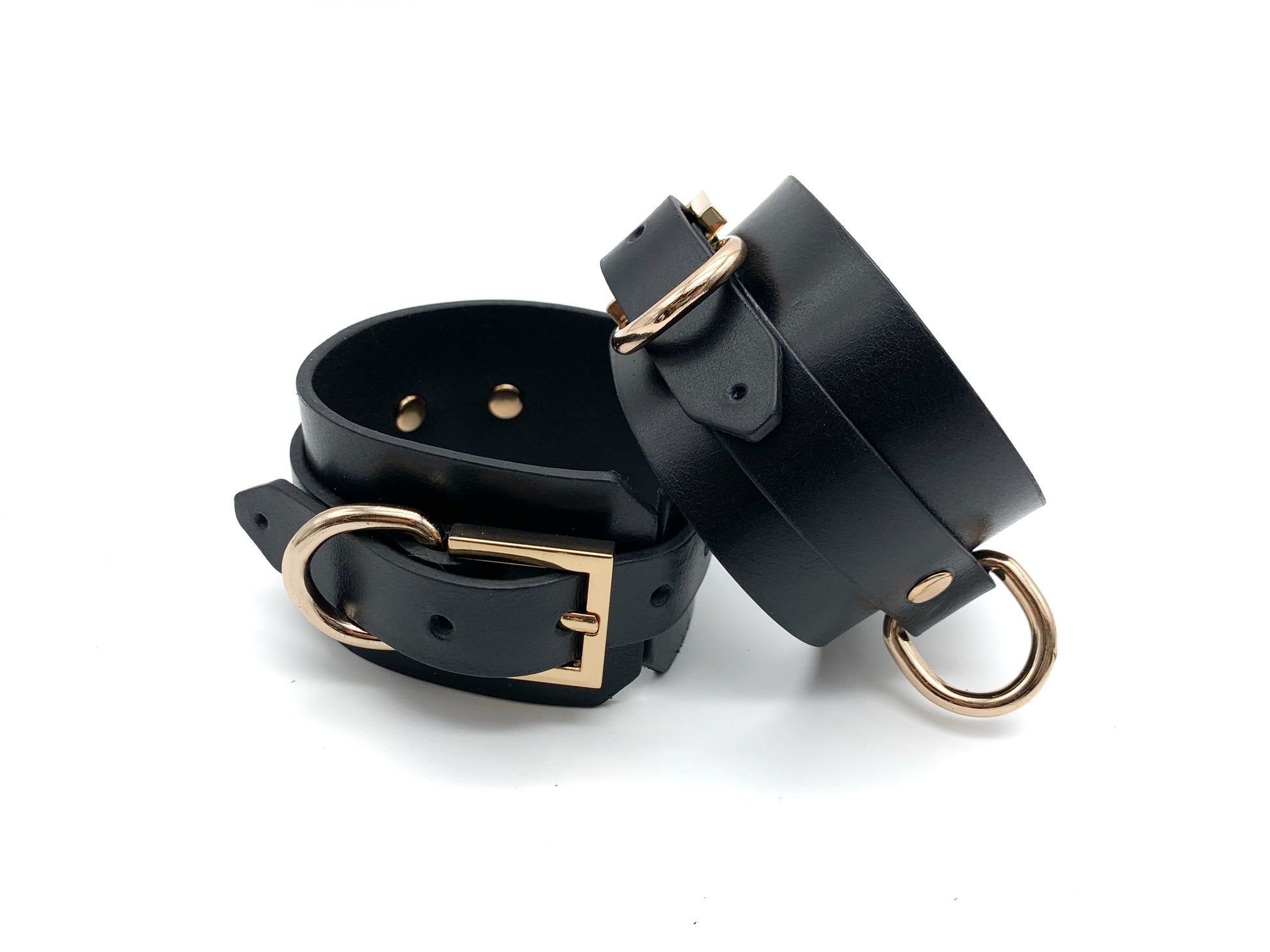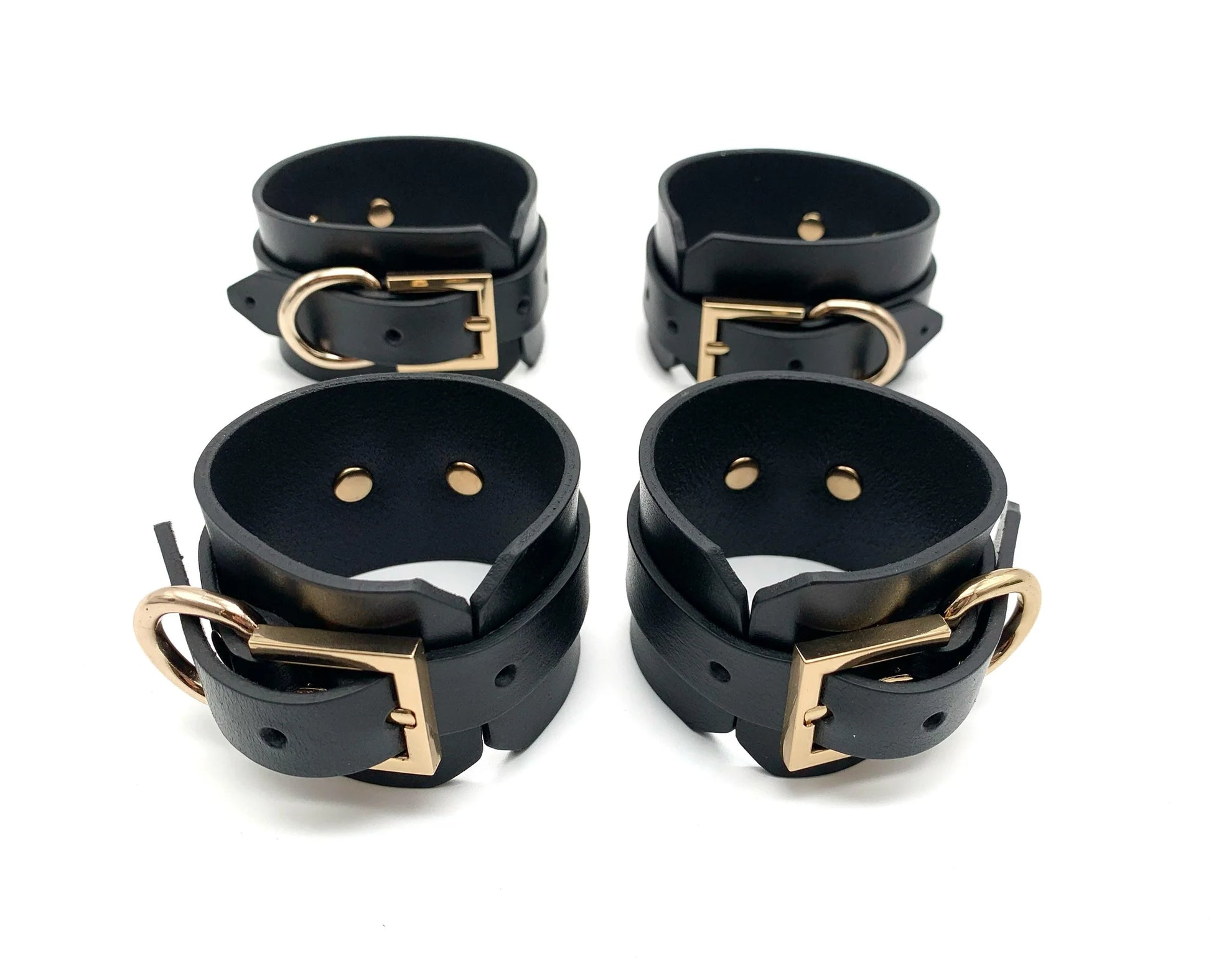 The Metatron leather set of wrist and ankle cuffs are handmade in thick vegetable-tanned leather, coming with silver or gold-toned nickel/brass plated metal hardware with fixed D-rings. Equipped with buckles and straps, the cuffs are perfectly adjustable to any wrist size and comfort level.