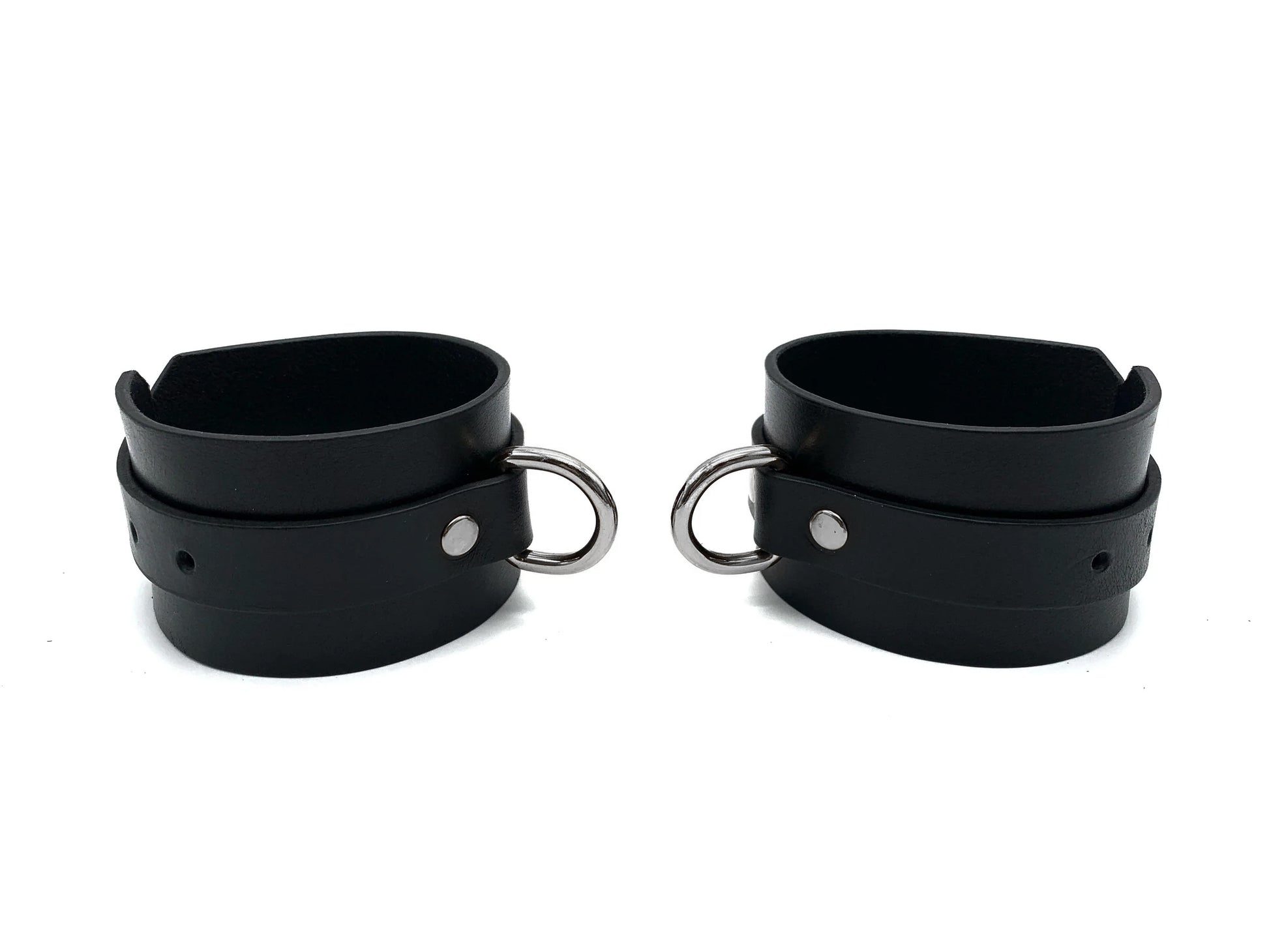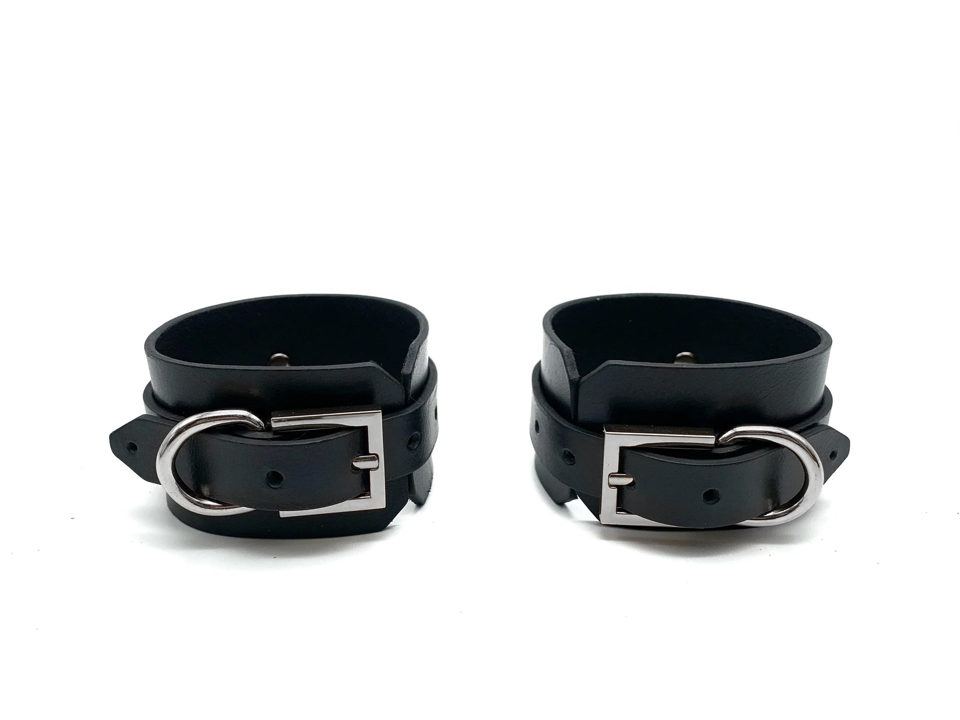 The Metatron leather set of wrist and ankle cuffs are handmade in thick vegetable-tanned leather, coming with silver-toned nickel plated metal hardware with fixed D-rings. Equipped with buckles and straps, the cuffs are perfectly adjustable to any wrist size and comfort level.